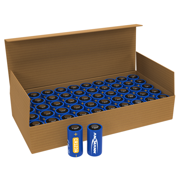 Ansmann's Bulk CR123A batteries are available in a box of 50, providing a substantial stock for extensive usage. Each battery has a nominal voltage of 3V, ensuring consistent and reliable power delivery across various devices. These batteries are particularly recommended for use in devices such as alarm systems, remote controls, garage door openers, and surveillance cameras, where consistent and long-lasting power is essential. The technical specifications of these batteries, including their lithium chemistry, black color, and blister packaging, add to their appeal for industrial and manufacturing applications. The wide operational temperature range of -20°C to +60°C, combined with their long shelf-life, make these batteries a practical and efficient choice for a range of professional uses.